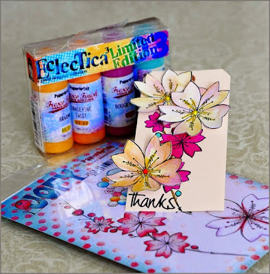 We really wanted to combine Jo's flowers in the stamp set with Lin's paints to give a tropical feel. As the paints are so versatile, using a water brush with them on the cut out flowers you can see that they create a very different effect to when they are not watered down, as you can see from the bright pinks and blues on the base of the Manila Tag. The cut out flowers have been finished off by using Rangers Liquid Pearls in the centre of them and then glueing them to the Manila Tag with Cosmic Shimmer Acrylic Glue.